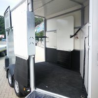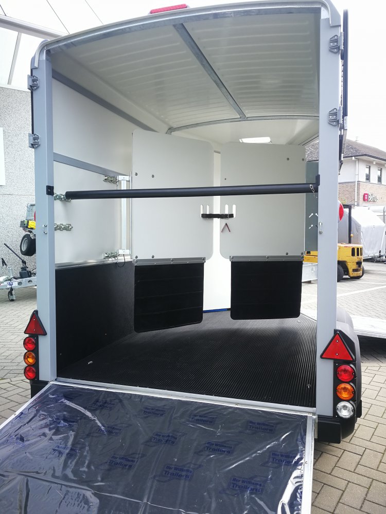 Een groot aantal paardenbezitters zijn van mening dat sommige paarden het moeilijk hebben om in de rijrichting vervoert te worden, waardoor ze tegen de zijwanden of de middenverdeling gaan leunen. Het diagonaal transporteren zorgt voor een beter evenwicht van de paarden (brede spreidstand van de poten), waardoor de paarden ook het remmen, het nemen van bochten of ronde punten beter aankunnen. Ifor Williams neemt daarom deze mogelijkheid op in haar gamma. Deze grote 2-paardstrailer is uiterlijk identiek dezelfde als de nieuwe HB511. Het interieur is echter aangepast voor het diagonaal positioneren van 2 paarden in de trailer. Dus in plaats van de standaard verticale middenverdeling, is deze uitgerust met een diagonale verdeling om de 2 paarden te scheiden. De witte verdeling (zelfde materiaal als zijwanden van onze boxvan) is bovendien voorzien van doorzichtige flappen. Het achterste deel van de verdeling kan op 3 posities versteld worden. Het voorste deel kan volledig naar buiten worden gedraaid en vastgezet. Achteraan wordt het paard tegengehouden door een lange bilstang, en vooraan door het pivoterende paneel van de geïntegreerde zadelkamer.
